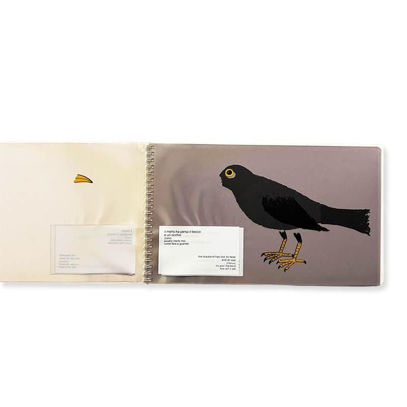 「くちばしを失ったクロウタドリ」は、ブルーノ・ムナーリによる1940年のプロジェクトから生まれた有名な民謡を視覚的に解釈した本。初版は1987年だが、本書は2003年にイタリアのマウリツィオ・コッライーニ社が製作した復刻版。シルクスクリーン印刷された透明なプラスチックシートは、クロウタドリの解体と組み立てを模倣し、その動きを伴っている。絵をめくりながら歌を探求できる、本とゲームが一体となった作品。