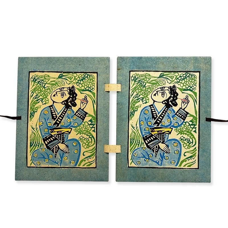 This is a collection of poems and illustrations by Nishikawa Mitsuru (1908-1999), one of Taiwan's leading literary figures and poets during the Japanese colonial period. It is limited to 85 copies, and the illustrations for the main text are hand-colored woodblock prints by Mine Rika, the cover is colored lacquer by Yoshida Keisuke, and the case is also double-sided stencil prints by the same artist, creating a binding design befitting a limited edition.