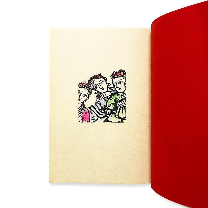 日本統治時代の台湾を代表する文学者・詩人の一人、西川満(1908-1999)の詩画集。限定85部で制作され、本文の装画は峯梨花による手彩色版画、表紙は吉田桂介による彩色漆装で帙も同氏によって両面型染版画装と限定本らしい造本設計。