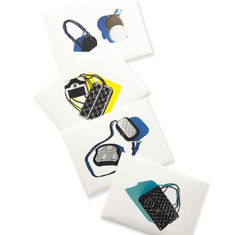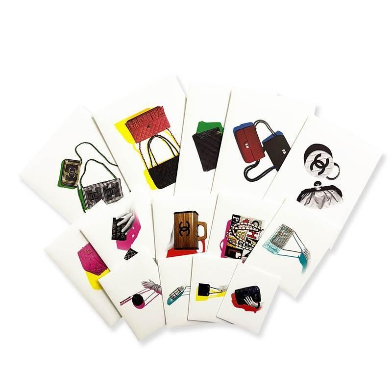 シャネルが2008年に制作したノベルティグッズ。カール・ラガーフェルドが撮影したバッグなどの写真が印刷された白い封筒を開けると、また少し小さい白い封筒が入っている。開封していくとどんどん封筒のサイズは小さくなっていき、まるでマトリョーシカのような仕掛けとなっている。最後のピースは手のひらに収まるほどのサイズ。全26枚。