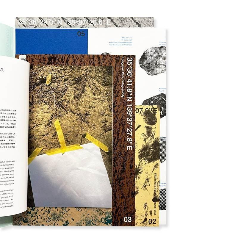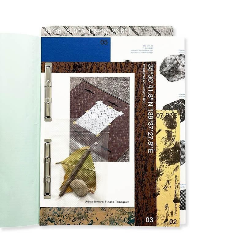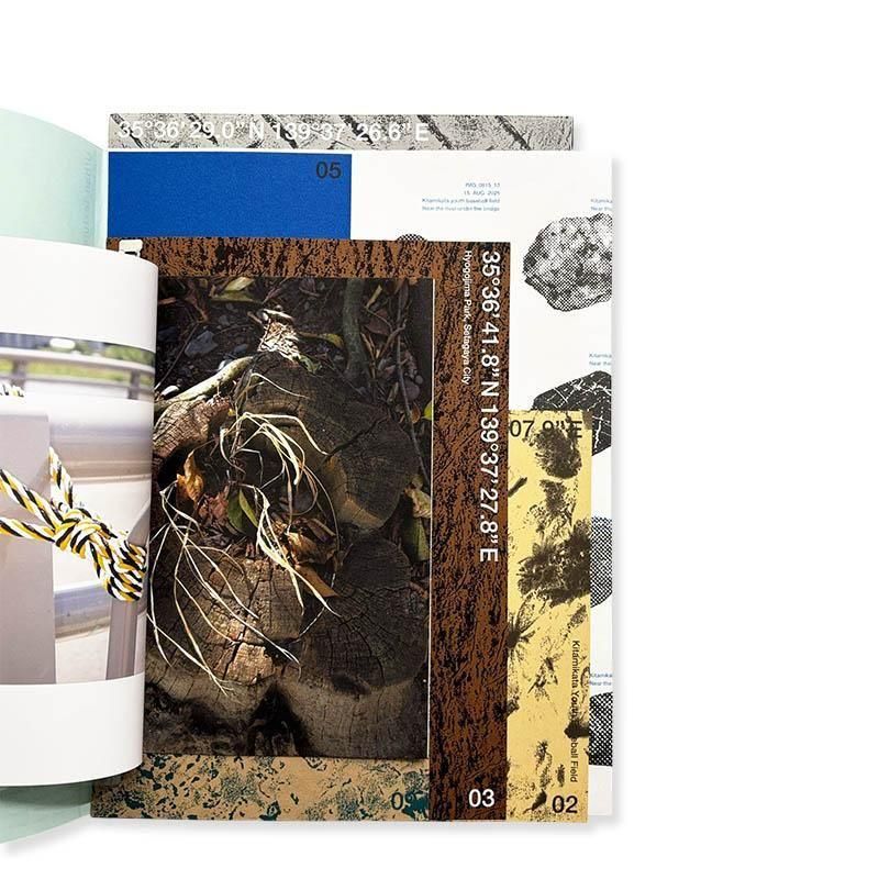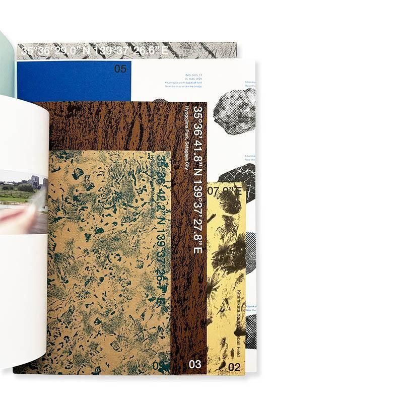 This zine by graphic designer Rinko Kawashima is an attempt to visualize the city's breathing and natural rhythms by using a technique called wet reclamation to collect samples of the surface of the Futako Tamagawa area and transferring them onto paper. The textures and silhouettes of man-made objects such as steel plates and natural objects such as trees and stones are bound together using multiple printing techniques. Locally collected items are also included.